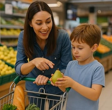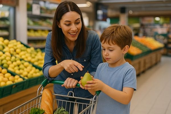 Educação no lar: orientações dadas pelos pais em situações cotidianas, como compras no mercado.
